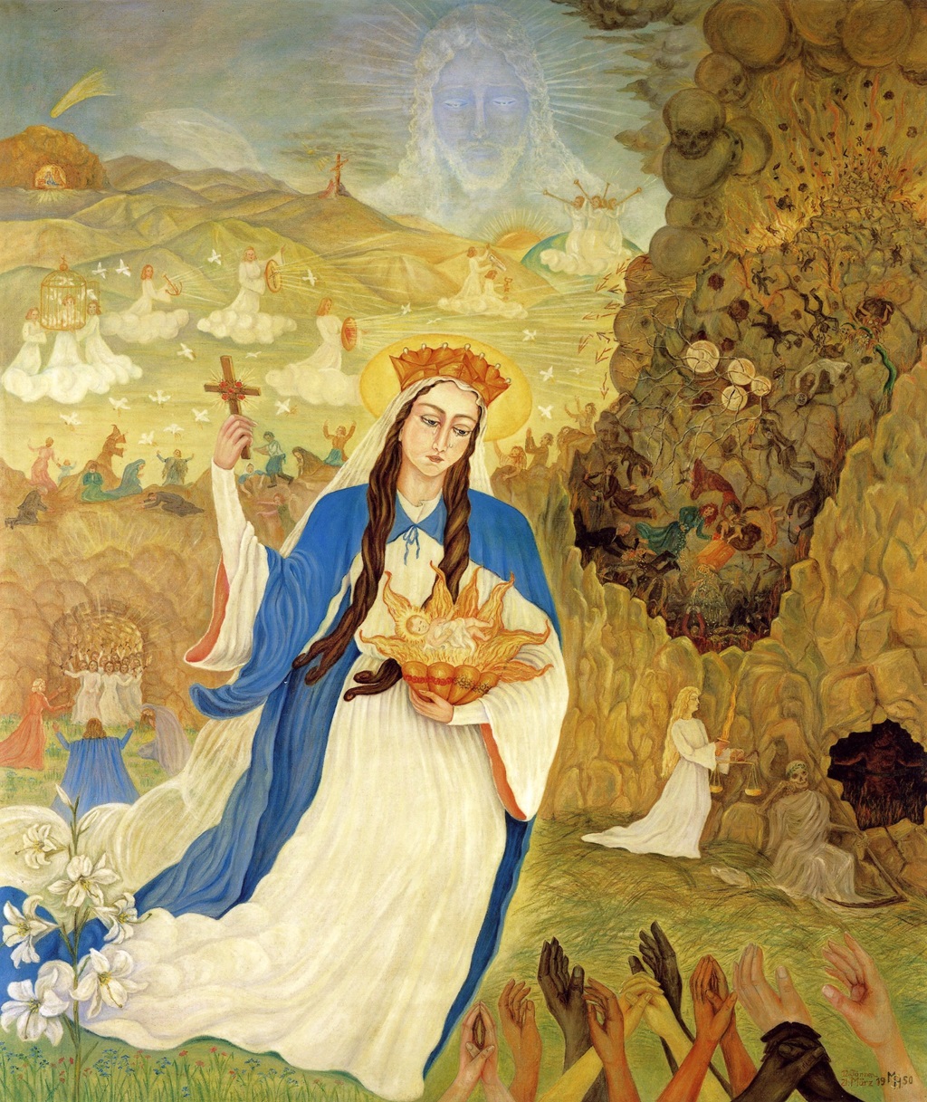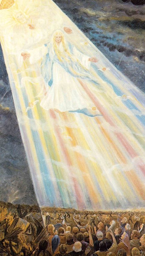 Zur Linken des Sohnes steht Mutter Maria, unsere Fürsprecherin und Vermittlerin der Gnaden. Weit breitet sie den blauen Mantel aus für die ganze Menschheit aller Rassen und Nationen: Maria, die Weltenmutter. Leni sagte dazu, dass alle Rassen und Nationen von ihrem bisherigen Irrglauben befreit würden und Aufnahme fänden in dieser Weltkirche Christi.