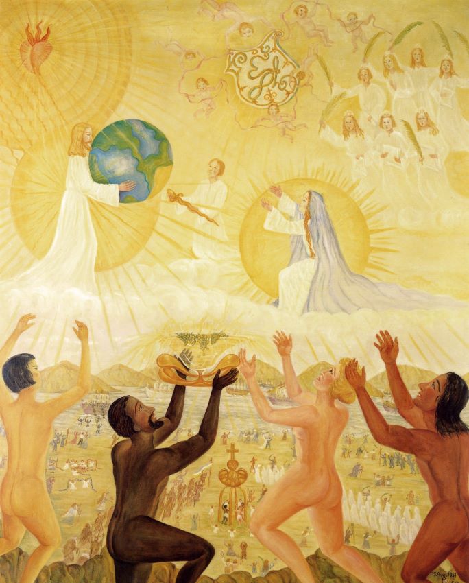 Der Sohn ist in seiner letzten Inkarnation angelangt und hat den Auferstehungsleib erlangt, wie JESUS dies einst selbst vorgelebt hat. Dazu musste sein Körper von allen alten Schlacken gereinigt sein, was mit Hilfe der Mutter geschehen konnte. Mit dem Mikrokosmos ist auch der Makrokosmos gereinigt, und so kann er die gereinigte, neue Erde der Mutter übergeben, so dass das Zeitalter des Heiligen Geistes beginnen kann. Alle Rassen und Nationen feiern und lobpreisen Gott, den VATER. Sie werden brüderlich zusammenströmen von Ost, Süd, Nord und West, um dem flammenden Herzen, der flammenden Vaterliebe (oben links) zu huldigen. Die Schale mit Trauben und Ähren, die emporgehalten wird, bedeutet: Empfang neuer Wahrheiten – und Fruchtbarkeit.
